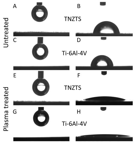 Schematic presentation of the sessile drop contact angle test results. A drop prior to the application on untreated TNZTS (A) and Ti-6Al-4V (C) and after being set from the needle onto untreated TNZTS (B) and Ti-6Al-4V (D). Following O2 plasma treatment of TNZTS and Ti-6Al-4V, wettability analysis pointed to increased hydrophilicity. Drops (before the application on TNZTS (E) and Ti-6Al-4V (G)) were almost completely infiltrated into the specimen (Ti-6Al-4V, (H)) or displayed a significant reduction in their contact angle (TNZTS, (F)).