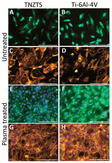 Additionally, in vivo experiments with O2-plasma-treated Ti specimens demonstrated enhanced bone healing []. Hence, the present results showing significantly increased biocompatibility of O2-plasma-treated TNZTS and Ti-6Al-4V alloy scaffolds seeded with primary human osteoblasts contributes to the body of evidence that indicates the excellent potential of O2-plasma-treated biomedical Ti-based alloys.