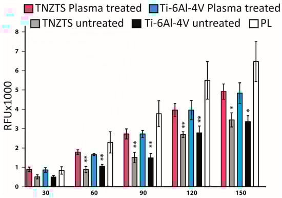 Summary of the results of resazurin reduction in primary human osteoblast cell cultures at 24 h after seeding, indicating mitochondrial activity. Cells were cultured on untreated and oxygen plasma-treated metallic substrates (TNZTS alloy, Ti-6Al-4V) and cell culture plate plastic. The measurements were made over time with 30 min interval (30 min–150 min), data represent mean ± SD; n = 3. * for p < 0.1; ** for p < 0.05 are shown relative to those obtained on cell culture plate plastic.
