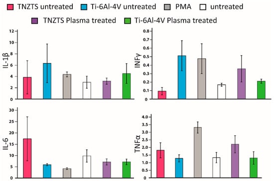 The levels of pro-inflammatory proteins were not significantly elevated in O2-plasma-treated metallic substrates in comparison to untreated cells (Figure 14), indicating that these substrates would not trigger inflammatory responses by activating macrophages.