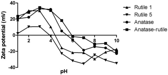 Zeta potentials were followed at various pH (Figure 2) and the course of ζ vs. pH dependencies exhibited a similar trend. The isoelectric point (IEP), however, varied within the pH range of ~4–6, and both Rutile samples displayed IEPs below pH 5, in contrast to Anatase and Anatase/Rutile samples, which exhibited IEPs of 5.5 and 6.0, respectively. Most commercial TiO2 nano-powders exhibit IEPs ranging widely from pH 2–9 [31]. The differences can be attributed to various factors, such as the insufficient surface purity of TiO2 NPs [10] or the size and shape of NPs [32]. Low IEP values resulting from the presence of phosphates or other anionic impurities in commercial TiO2 was observed by [33]. In this context, a study by Suttiponparnit et al. suggested that the crystallographic structure of TiO2 NPs has no significant effect on IEP [32].