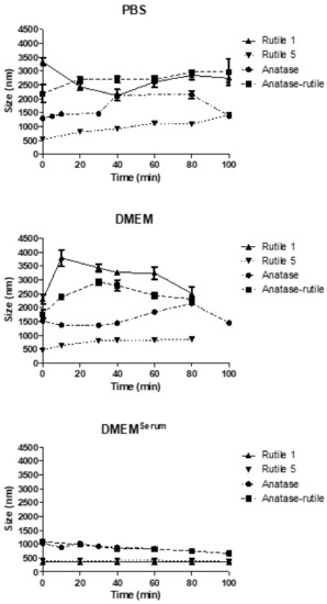 In serum free DMEM, samples also agglomerated thanks to the presence of electrolytes screening the particle surface charge. After the initial increase in particle size observed immediately after dilution with DMEM, the behavior of individual samples differed (Figure 3). However, the extent of agglomeration in DMEM was roughly similar as in PBS, with Rutile 5 particles showing both the smallest initial agglomeration and a lower agglomeration rate over time.