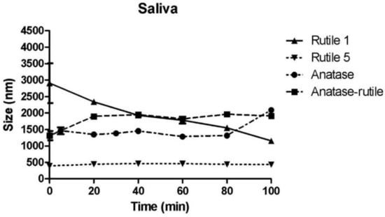 Saliva present in the oral cavity represents the first component of the gastrointestinal system, which rapidly interacts with NPs [34]. Correspondingly to the TiO2 particles dispersed in physiological media discussed above, the particles in simulated saliva (pH 6.8) agglomerated (Figure 4). For Rutile 1, the maximum size of agglomerates/particles was recorded immediately after mixing with saliva (2908 ± 854 nm); these agglomerates/particles then gradually decreasing in size during the prolonged time of mutual contact with the saliva. Rutile 5 particles changed the least due to the action of saliva. After an initial increase from 287 ± 8 nm (water) to 392 ± 13 nm (saliva), the particle diameter remained almost unchanged for the remainder of the measurement time. In Anatase/Rutile and Anatase, significant agglomeration was observed, though it was minor in comparison with Rutile 1. The results presented here are consistent with a study by Teubl et al., which reported a significant agglomeration of TiO2 NPs in simulated saliva independent of the surface properties (hydrophilicity/hydrophobicity) of the NPs [34]. Additionally, Sohal et al. investigated anatase NPs in simulated saliva by evaluating statistically significant changes in NP concentration over a range of nanoparticle sizes, and analyzed the anatase particles at two time points: immediately after mixing and then 60 min after mixing. The authors did not observe any notable changes in the concentration of anatase nanoparticles in the simulated saliva across the range of the investigated nanoparticle sizes [42]. The results of our study comply with the observations presented in the Sohal’s paper, showing a virtual steady state with respect to the size of TiO2 NPs during the entire measurement time. However, our results also show that agglomerates on particles form rapidly and immediately after mixing with saliva. On the other hand, these agglomerates may disintegrate and equilibrium may be established between agglomerated and non-agglomerated particles.