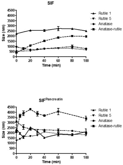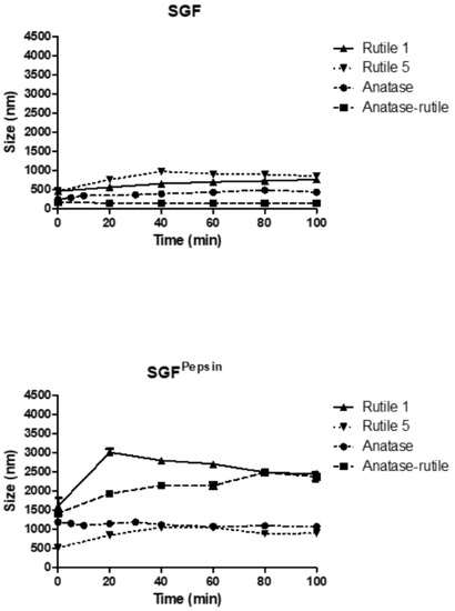 After swallowing, the particles pass through the esophagus into the stomach and come into contact with gastric fluid. When mixed with SGF (pH 1.2), the behavior of the TiO2 particles was fundamentally different from that observed in other simulated body fluids (Figure 5). In SGF, particles of Rutile 1 increased their size to 459 ± 16 nm and, due to the slow aggregation, their size grew further to a final value of 762 ± 21 nm. Overall, the particles grew three times in size from the original value of 215 ± 1 nm determined in Milli-Q water. Similarly, the size of Rutile 5 particles increased, reaching a slightly higher maximum size of 973 ± 24 nm. Anatase/Rutile particles were the most stable in the SGF environment, with their size increasing only to a maximum value of 169 ± 10 nm from a reference value of 142 ± 2 nm in Milli-Q and changing only slightly with the measurement time. Anatase in SGF revealed a lower particle size than in water, reaching, after mixing, a size of 241 ± 9 nm, which then increased steadily to a maximum value of 478 ± 17 nm during the measurement time. Thus, the low pH of SGF (1.2) appears to contribute to lower particle agglomeration compared to other simulated fluids, though the charge and agglomeration of TiO2 NPs also strongly depends on the pH [43]. In this context, Cho et al. reported on TiO2 NPs incubated in acidic gastric fluid (pH 1.5–2.0) and water (pH 7.4), with their results showing only a minimal dissolution of NPs in both acidic gastric fluid and water [2].