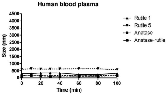 In contrast to the other tested fluids, all samples in blood plasma (Figure 7) changed less during the course of the measurement. The smallest change in particle size after direct mixing with blood plasma was observed with Rutile 1, with only a slight increase in size from 215 ± 1 nm (MilliQ water) to 318 ± 11 nm. Conversely, the particle size increased most markedly for Rutile 5 from the reference value of 287 ± 8 nm to the value of 607 ± 22 nm. In contrast, particles of Anatase/Rutile and Anatase samples were even smaller in plasma than in water. The low agglomeration of TiO2 particles in blood plasma compared to other fluids is conditioned by their rapid interactions with proteins the plasma contains, and the formation of a protein corona discussed above. Deng et al. studied the binding of human plasma proteins to commercially available metal oxides, including TiO2 NPs, and observed the agglomeration of TiO2 NPs in water, buffer, and biological media, which led to an increase in the amount and number of different proteins bound to these nanoparticles. The binding of plasma proteins to metal oxide NPs reached equilibrium during the first five minutes of incubation, which could explain the constant particle size observed throughout the measurement period in our study. Deng et al. further identified specific blood plasma proteins that bind to TiO2 NPs; namely, apolipoprotein A1, albumin, immunoglobulins (IgM and IgG), fibrinogen, and a number of other minor proteins [48]. Although albumin is the most plentiful protein in plasma, it was associated with metal oxides at fairly low levels. In a study conducted by Ruh et al., fibrinogen demonstrated the strongest affinity for all tested NPs, including TiO2, which could then hinder the adsorption of other proteins. In addition, the authors found that protein adsorption may depend on the crystal structure of TiO2 NPs, and reported, contrary to expectations, that smaller particles with a higher specific surface area do not bind more protein than larger particles [49]. Marucco et al. further found that both albumin and fibrinogen interact irreversibly with the negative surface of TiO2 NP where the interaction with albumin appears to be controlled by conformational changes of the protein at the surface due to its low resistance to deformation, while interactions with fibrinogen are conditioned by both conformational changes and electrostatic forces between TiO2 surface and the positive domains of the proteins [50]. According to Deng et al., the state of agglomeration greatly influences the binding of plasma proteins, and therefore, the resulting biodistribution may be, to a certain extent, dictated by the degree of agglomeration of nanoparticles, with this affecting cell surface protein binding [48].