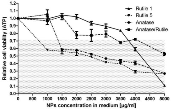 Cytotoxicity data determined with NIH/3T3 cells demonstrated an effect dependent on the type of tested TiO2 particles. The lowest cytotoxic effects were recorded for Rutile 1 and the Anatase/Rutile mixture, which were cytotoxic at TiO2 particle concentrations of 4000 and 3500 µg/mL, respectively. Higher cytotoxicity was yielded by Anatase and Rutile 5, which were cytotoxic at 1500 µg/mL.
