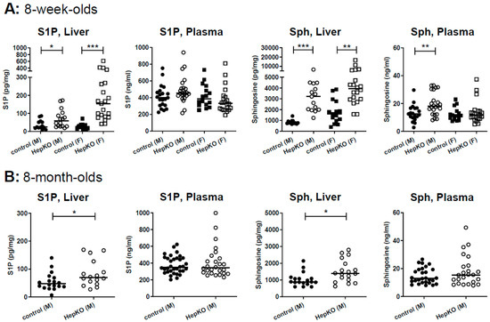 LC-MS/MS analysis of S1P and sphingosine revealed that hepatocyte-specific Sgpl1 deletion led to a significant accumulation of both lipids in the liver of 8-week-old mice (Figure 2A). Of note, plasma S1P was not significantly elevated by hepatocyte-specific Sgpl1 deletion, while plasma sphingosine was slightly elevated (~1.5-fold) in male but not female Sgpl1HepKO mice (Figure 2A). At the age of 8 months, S1P and sphingosine were again elevated in the liver of Sgpl1HepKO mice, but in contrast to our expectation, not as much as at the younger age (Figure 2B). Thus, sphingosine levels in liver were increased by 3.8 ± 0.4-fold in 8-week-old but only by 1.5 ± 0.2-fold in 8-month-old Sgpl1HepKO mice (means ± SEM; p < 0.0001; Figure 2A,B). Importantly, plasma concentrations of S1P and sphingosine were normal in 8-month-old Sgpl1HepKO mice (Figure 2B). These results, together with the normal liver weight and structure reported above, suggest that there are mechanisms which compensate for loss of SGPL1 in hepatocytes, and that these compensatory mechanisms are more effective with age.