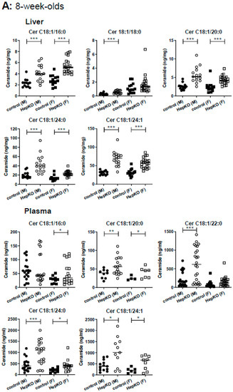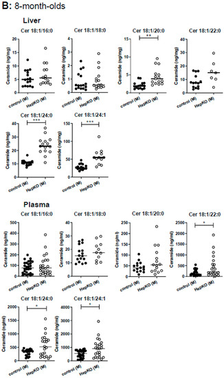 Levels of ceramides in liver and plasma of Sgpl1HepKO mice. Ceramide (Cer) levels were measured by LC-MS/MS in liver and plasma of Sgpl1control and Sgpl1HepKO mice at the age of 8 weeks (A) or 8 months (B). Shown are values from individual mice and their median. * p < 0.05, ** p < 0.01, *** p < 0.001 in two-tailed Student’s t-test with Welch’s correction (A, liver: n = 13–21; A, plasma: n = 4–24; B, liver: n = 7–16; B, plasma: n = 11–28).