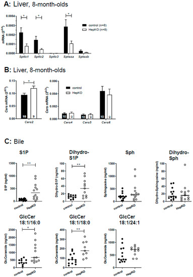 Aim of the present study was to characterize the role of hepatocyte Sgpl1 for regulation of sphingolipid metabolism and cholesterol homoeostasis. We show here that mice with hepatocyte-specific Sgpl1 knockout (Sgpl1HepKO) did not differ much from control mice from the same breed (Sgpl1control). Interestingly, very long chain ceramides were elevated in plasma, and S1P and glucosylceramides were elevated in bile of Sgpl1HepKO mice, indicating that mouse liver effectively eliminated excess sphingolipids via secretion into blood and bile.