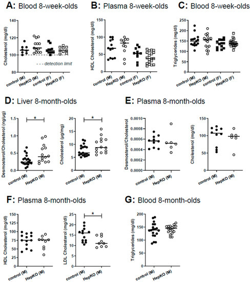 Cholesterol and triglyceride content in liver and plasma of Sgpl1HepKO mice. Total cholesterol (whole blood, A), HDL cholesterol (plasma, B) and triglycerides (whole blood, C) were measured in 8 week old mice using a Reflotron analyser. (D–G) Cholesterol and triglycerides in 8 month old mice. (D,E) Cholesterol and its precursor desmosterol were determined by gas chromatography-flame ionization detection and gas chromatography-mass spectrometry, respectively, in liver (D) and plasma (E). Desmosterol is expressed as fold cholesterol. (F) HDL and LDL cholesterol in plasma were determined photometrically. (G) Triglycerides were determined in whole blood using a Reflotron analyser. Shown are values from individual mice and their median (A, n = 8–13; B, n = 10–19; C, n = 13–20; D, n = 14 and 19; E, n = 6 and 10; F, n = 9 and 13; G, n = 18 and 19). * p < 0.05 in two-tailed Student’s t-test.