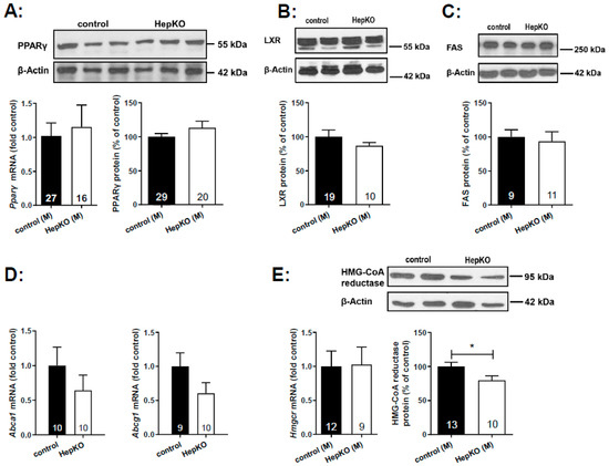 Expression of key enzymes of cholesterol and lipid homeostasis was analyzed by quantitative polymerase chain reaction (PCR) and Western blot in liver homogenates of 8-month-old mice (Figure 6). Bektas et al. had shown a ~3.5-fold upregulation of Pparγ mRNA in the liver of global Sgpl1 knockout mice [18]. However, hepatocyte-specific deletion of Sgpl1 did not alter mRNA or protein expression of PPARγ in the liver (Figure 6A). Similarly, protein expression of liver X receptor was unaltered (Figure 6B). Furthermore, expression of LXR target genes such as fatty acid synthase (protein; Figure 6C), and the cholesterol transporters, Abca1 and Abcg1 (mRNA; Figure 6D) were not significantly altered. Western blot analysis revealed a slight decrease in HMG-CoA reductase protein (Figure 6E), despite the increased concentrations of the cholesterol precursor molecule, desmosterol, described above.
