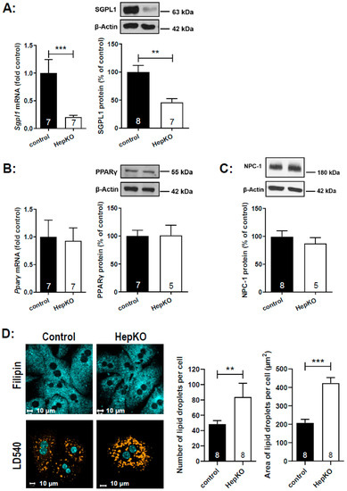 For further functional analysis, we isolated hepatocytes from Sgpl1control and Sgpl1HepKO mice. Expression of Sgpl1 mRNA and SGPL1 protein was strongly reduced in these primary cell cultures, but not zero (Figure 7A). This is likely due to contamination of hepatocyte cultures with other cell types (not shown). Similar to the liver homogenates, mRNA and protein expression of PPARγ (Figure 7B) and protein expression of NPC-1 (Figure 7C) was not altered in hepatocytes from Sgpl1HepKO mice. In search for a NPCD-like phenotype, we stained the hepatocytes with the cholesterol-binding dye, filipin. However, we did not see any cholesterol sequestration in hepatocytes from Sgpl1HepKO mice (Figure 7D). On the other hand, staining of neutral lipids with LD540 revealed that Sgpl1-deficient hepatocytes had ~1.7-fold more lipid droplets than control hepatocytes (Figure 7D). The area covered by droplets was ~200 µm2 per cell in control hepatocytes, but ~400 µm2 per cell in Sgpl1-deficient hepatocytes (Figure 7D). Although we did not analyze the content of the droplets, it may be speculated that part of the accumulating ceramides was stored there as acyl-ceramides [32].