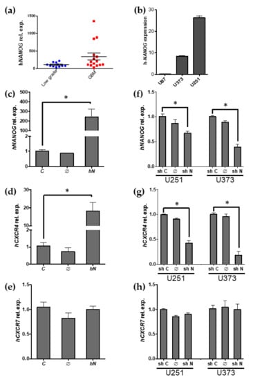 Nanog is expressed in various kinds of human tumors, including glioblastoma (Figure 3a), the most common malignant primary brain tumors [,,]. On the other hand, CXCR4 controls the migration of neuronal cells [,], and it is the most common chemokine receptor expressed by many cancer cells, including glioblastoma [,], where CXCR4 plays a role in cancer cell migration []. To find out if h-NANOG can regulate CXCR4 expression in human cancer cells, we studied how changes in h-NANOG level affected the expression of CXCR4 in human glioblastoma and astrocytoma cell lines.