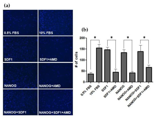 U-87 cells were plated in 6 mm plates in a density of 7 × 105 cell/well 24 h prior to transfection. Transfection mixes were prepared with FuGENE HD (Ref. E2311, Promega; Madison, WI, USA) and 0.45 µg of pCS2-h-NANOG, or 0.45 µg of pCS2 empty vector. The cells were harvested and resuspended in serum-free GlutaMAX (supplemented with 1xMEM non-essential amino acids; Gibco; Dublin, Ireland) 48 h post transfection. Cells from each transfection were added to different upper chambers of the HTS-24 Multiwell Insert System plate (10,000 cells/chamber; Ref: 351185; BD Falcon; Franklin Lakes, NJ, USA) and 750 μL of serum-free GlutaMAX to lower chambers. Then, 24 h later, the media was removed and the following culture conditions were added to the chambers in triplicate: for cells transfected with the empty vector, one condition was 0.5% FBS-GlutaMAX in upper and lower chambers; the second condition was 0.5% FBS-GlutaMAX in upper chambers and 10% FBS-GlutaMAX in lower chambers; the third condition was 0.5% FBS-GlutaMAX plus 10 µM AMD3100 (Ref A5602; Sigma-Aldrich; St. Louis, MO, USA) in upper chambers and 0.5% FBS-GlutaMAX plus 0.05 µg/mL SDFα (Ref 300-28A; Bionova, Madrid, Spain) in lower chambers; and the last condition was 0.5% FBS-GlutaMAX in upper chambers and 0.5% FBS-GlutaMAX plus 0.05 µg/mL SDFα in lower chambers. For cells transfected with pCS2-h-NANOG vector, one condition was 0.5% FBS-GlutaMAX in upper and lower chambers, the second condition was 0.5% FBS-GlutaMAX in upper chambers and 0.5% FBS-GlutaMAX plus 0.05 µg/mL SDFα in lower chambers, the third condition was 0.5% FBS-GlutaMAX plus 10 µM AMD3100 in upper chambers and 0.5% FBS-GlutaMAX in lower chambers, and the last condition was 0.5% FBS-GlutaMAX plus 10 µM AMD3100 in upper chambers and 0.5% FBS-GlutaMAX plus 0.05 µg/mL SDFα in lower chambers. Plates were incubated at 37 °C for 4 h. After incubation, supernatants were discarded, membranes fixed with 4% formaldehyde for 20 min, and cells from upper chambers were removed with cotton buds. Cells that migrated throughout the membrane were stained with DAPI. Finally, four random fields per transwell were counted. This experiment was done in triplicate.