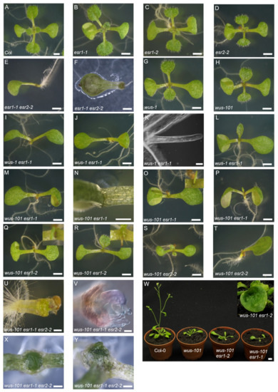 Although ESR1 and ESR2 have redundant functions and exhibit similar cotyledon phenotypes [,,], ESR1, in concert with WUS and STM, appears to play more important roles in lateral organ emergence and the establishment of adaxial–abaxial polarity.