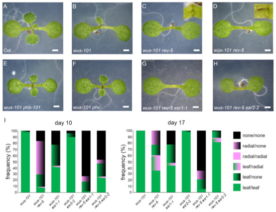 rev-5 but not phb-101 or phv enhances wus phenotype. (A) Five-day-old Col-0; (B) wus-101; (C,D) wus-101 rev-5, note the radial structure (inset) in (D); (E) wus-101 phb-101; (F) wus-101 phv; (G) wus-101 rev-5 esr1-1; (H) wus-101 rev-5 esr2-2; (I) frequency of phenotypes in the respective mutant background on 10 d.a.g (left) and 17 d.a.g. (right). At least 50 individual plants per genotype were examined with biological triplicates. The first pair of emerged rosette leaves are categorized into a developed leaf (green) or radial structure (pink). Black indicates no development of lateral organs at the indicated time points.