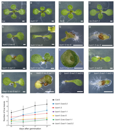 esr1 and rev additively enhance the bum phenotype. (A) Eight-day-old Col-0; (B) bum1-3; (C) rev-5; (D) rev-5 esr1-1; (E–H) bum1-3 rev-5, note the single cotyledon in (E) and radial structure (inset) in (F); (I–K) bum1-3 esr1-1; (L) bum1-3 esr2-2; (M,N) bum1-3 rev-5 esr1-1; (O,P) bum1-3 esr1-1 esr2-2; (Q) number of developed rosette leaves in the respective mutant backgrounds at 10, 14, 17, and 21 d. a. g. Data shown are the mean ± SD of biological triplicates (n > 50 per genotype). Scale bars = 1 mm.