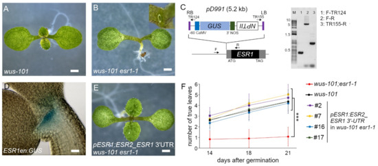 Arabidopsis thaliana accession Columbia-0 (Col-0) was used as the wild type. The seeds described below were obtained from the European Nottingham Arabidopsis Stock Centre (NASC)): esr1-1/drn-2 (N121728) [,] wus-101 (N483520) [], wus-1 (N15) [], phv (N862830) [], phb-101 (N654985), esr1-2 (N321463), and bum1-3 (N3781). Homozygous seeds of esr2-2 were kindly obtained from Hiroharu Banno []. rev-5 (Col-0 accession) was originally isolated in Luca Comai’s lab and homozygous seeds were kindly obtained through Ida Ruberti []. Prior to making higher-order mutants, all mutants employed in this work were backcrossed at least four times and the original wus-1 (Ler accession) was introgressed into Col-0 through repetitive crossing with Col-0 six times. Mutations were genotyped by PCR by a conventional method. For genotyping esr2-2, wus-1, bum1-3, and rev-5, dCAPS markers were developed and the respective PCR products were digested with EcoRV, NcoI, ClaI, or SnaBI, respectively. Primers used for the genotyping are listed in Supplementary Table S1. The GUS enhancer reporter line, ESR1en:GUS, was obtained by PCR-based screening [] and additional T-DNA insertions present in the original ESR1en:GUS were segregated out by repetitive backcrossing with Col-0 five times. A single pD991 T-DNA insertion in the ESR1 locus was confirmed by kanamycin segregation analysis and Southern blotting. Primers used for the screening and confirming the insertion position of T-DNA are listed in Supplementary Table S1. Seeds were surface-sterilized, sown on MS plant agar medium, and grown at 21 °C in a photoperiod of 16/8 (light/dark) condition at the indicated days. Clearing of seedlings and photographing differential interference contrast (DIC) were carried out as described previously []. Seedlings were photographed by a Stereoscopic Zoom Microscope SMZ1000 (Nikon, Tokyo, Japan) operated with NIS Elements software at the indicated time points.