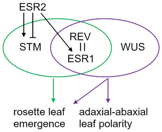 Schematic representation of genetic interactions. The REV and ESR1 protein interaction is confirmed. Together with STM or WUS, both ESR1 and REV participate in the rosette leaf emergence and the establishment of adaxial–abaxial polarity. ESR2 and ESR1 are functionally interchangeable whereas the effect of ESR2 on rosette leaf emergence in the stm/bum mutant is vegetative phase-dependent.