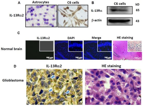 Distinct IL-13Rα2 immunohistochemical staining in rat C6 glioblastoma cells in vitro and human glioblastoma cells in vivo but not in rat astrocytes and normal brain tissue. (A) IL-13Rα2-oriented immunocytochemical staining performed on rat astrocytes and C6 cells; (B) Western blotting demonstration of IL-13Rα2 expression in C6 cells; (C) absence of IL-13Rα2 immunofluorescent labeling in the normal rat brain tissue; (D) immunohistochemical demonstration of IL-13Rα2 expression and membranous location (arrow-indicated; ×40) in the case of human glioblastoma multiforme.