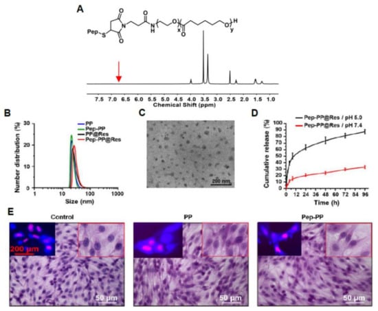 As shown in Figure 2A, after reacting with the sulfhydryl group of Pep-1 peptides, the characteristic peak at 6.7 ppm of the maleimide group (red arrow) disappeared, indicating that Pep-1 peptides was successfully conjugated with a Mal-PEG3.5K-b-PCL4K copolymer. TEM and DLS demonstrated that the sizes of PP, Pep-PP and PP@Res were less than 30 nm with unimodal distribution (Figure 2B). After being conjugated with Pep-1, the Pep-PP@Res particles maintained unimodal distribution, and their sizes were enlarged to 30 ± 4.8 nm (Figure 2C). The drug loading capacity was 8% for PP@Res and 7.9% for Pep-PP@Res. In vitro Pep-PP@Res release analyses showed a pH-sensitive behavior, and burst release appeared in the first 8 h in both media, especially in the medium at pH 5.0 (Figure 2D). The cumulative Res release from Pep-PP@Res was 75% and 25% at pH 5.0 and pH 7.4 at 48 h, respectively.