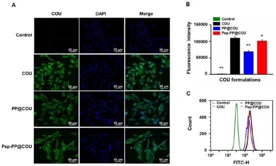 Evaluation of nanoparticle internalization efficacy via quantification of cellular uptake of COU, PP@COU and Pep-PP-COU. Cellular uptake of COU, PP@COU and Pep-PP-COU was illustrated (A) and quantified (B) through tracing COU fluorescent intensities. Scale bar, 50 μm. Quantitative analysis of cellular uptake using flow cytometry (C). Note: * and ** indicate p-values < 0.05 and < 0.001, respectively, when compared with Pep-PP@COU.