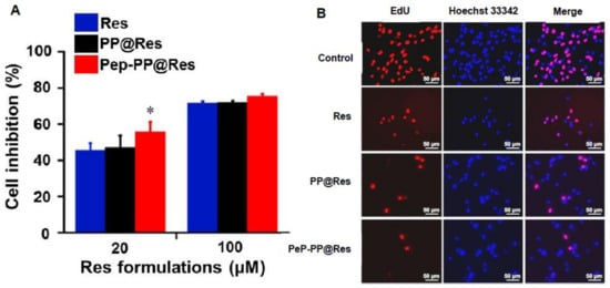 The C6 cells were exposed for 4 h to Res, PP@Res and Pep-PP@Res in the concentrations of 20 μM or 100 μM, respectively, and then placed in a normal culture medium. This performance was repeated two times in one-day intervals before the MTT assay. The cell inhibition rate was 55.8 ± 5.5% for 20 μM Pep-PP@Res, compared with 47.2 ± 6.5% for PP@Res (p = 0.024) and 45.6 ± 4.0% for free Res (p = 0.009) at the same concentration. At the concentration of 100 μM, the differences between the cell inhibition rates of the three Res formulations were narrowed in the form of 75.4 ± 1.4%, 71.9 ± 1.1% (p = 0.03) and 71.5 ± 1.1% (p = 0.02) for Pep-PP@Res, PP@Res and Res, respectively (Figure 4A). The EdU cell proliferation assay was performed to further demonstrate the growth-suppressive effect of the Res formulations. As shown in Figure 4B, the frequencies of the red EdU fluorescent signal were greatly decreased in the C6 cell populations treated with the three 100 µΜ Res formulations, especially in the Pep-PP@Res-treated one.