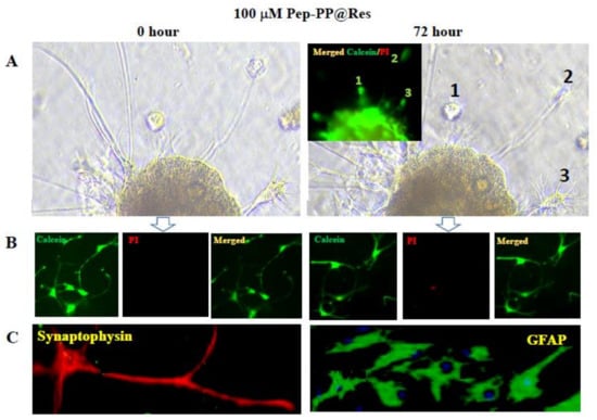 The 1:2 Matrigel and NeurobasalTM-A mixture successfully helped the normal brain tissues to attach to the well surface. Cell outgrowth from the brain tissues was observed after 48 h of culturing and became distinct after one week. The cell-bearing coverslips were then treated with 100 mM Pep-PP@Res for 72 h. As shown in the phase-contrast microscopic images, no obvious morphological change was observed between the brain tissues at the 0 h and 72 h timepoints of the Pep-PP@Res treatment (Figure 5A). The calcein/PI assay showed no signs of cell death (PI-labeled red nucleus) in the cultured brain tissues (the inset in Figure 5A) and brain cells (Figure 5B) after 72 h of the Pep-PP@Res treatment. Immunofluorescent staining further confirmed intact synaptophysin-labeled neurons and GFAP-labeled glial cells in the 2D+ cultured cell population after 72 h of the Pep-PP@Res treatment (Figure 5C).