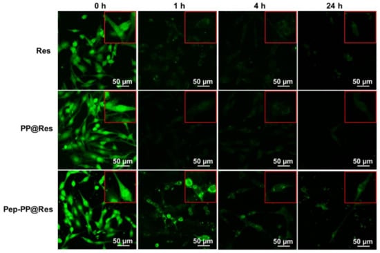 Res generates green fluorescence at 405 nm that can be captured with fluorescent confocal microscopy []. The reason(s) why Pep-PP@Res increased the growth-suppressive rate was investigated by means of fluorescence confocal microscopy-based evaluation of the intracellular retention time of Res. As shown in Figure 6, after 4 h of treatment with Res formulations, granular green fluorescent signals can be observed in whole cells, especially in the nuclei, indicating the general intracellular distribution of Res in the treated C6 cells. The intensity of green fluorescence quickly decreased after withdrawing the Res formulations. At the 24 h timepoint, the green fluorescent signal was barely seen inside the cells, except for the ones treated with Pep-PP@Res.
