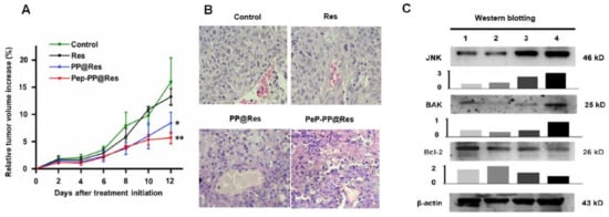 Pep-PP@Res inhibited growth and activated JNK signaling of the C6 xenografts in nude mice. (A) Relative tumor volume increase (%) after drug treatments. Note: * and ** indicate p-values < 0.05 and < 0.01 in comparison with the control group. (B) The morphology of tumor tissues in the four experimental groups and the extensive cell death in the Pep-PP@Res-treated tumor tissues; scale bar, 50 μm. (C) Western blot examination of JNK signaling statuses in the C6 cells without drug treatment (1) and treated by free Res (2), PP@Res (3) and Pep-PP@Res (4). Grayscale analyses were conducted on the Western blot results.
