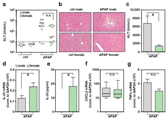 Increased production of IL-22 by female mice undergoing APAP-induced ALI: female and male C57BL/6J mice were treated with either 0.9% NaCl (ctrl) or APAP (300 mg/kg). After 6 h (a,b,d–g) or 24 h (c), mice were sacrificed and liver tissue and sera were analyzed. Liver damage was determined by serum ALT after 6 h (a) or 24 h (c) ((a): n = 7 for ctrl, n = 13 for APAP; *** p < 0.001 versus ctrl-male; (c): n = 5; # p < 0.05). (b) Liver sections (H&E) are shown for representative specimens, labeled red in subfigure (a). Hepatic mRNA expression for IL-22 (d), CXCL2 (f), and TNFα (g) was determined by real-time PCR and normalized to GAPDH, and is shown as absolute values (n = 10 for APAP-male; n = 9 for APAP-female; # p < 0.05). (e) Serum IL-22 analyzed by ELISA (n = 7 for APAP-male, n = 8 for APAP-female; # p < 0.05). Statistical analysis: (a) raw data were analyzed by Kruskal–Wallis with post hoc Dunn’s correction, (f) raw data were analyzed by Mann–Whitney-U-test, data are shown as box-plots; (c–e,g) raw data were analyzed by unpaired Student’s t-test, data are shown as means ± SEM. n.s., not statistically significant.