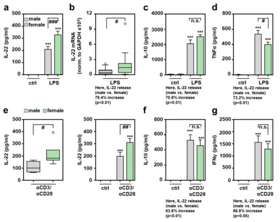 Increased production of IL-22 by female splenocytes exposed to LPS or αCD3/CD28: freshly isolated male and female murine splenocytes of C57BL/6J mice were kept as unstimulated ctrl or stimulated with LPS (1 µg/mL) for 48 h (a–d) or with agonistic αCD3/CD28 (2 µg/mL, 0.2 µg/mL) for 24 h ((e)-left panel) or 48 h ((e)-right panel, (f,g)). Release of the indicated cytokines was determined by ELISA: IL-22 (a,e), IL-10 (c,f), TNFα (d), and IFNγ (g) ((a): n = 33; (c): n = 8–14; (d): n = 13–17; (e)-left: n = 4–6; (e)-right: n = 12–16; (f): n = 11–13; (g): n = 8–13; *** p < 0.001 versus ctrl of respective sex, # p < 0.05, ## p < 0.01, ### p < 0.001). (b) Splenic mRNA expression for IL-22 was determined by real-time PCR and normalized to GAPDH, and is shown as absolute values (n = 19; # p < 0.05). Statistical analysis: (a,c,d,e-right,f,g) raw data were analyzed by one-way ANOVA with post hoc Bonferroni correction, data are shown as means ± SEM; (b,e-left) Mann–Whitney-U-test, data are shown as box-plots. n.s., not statistically significant.