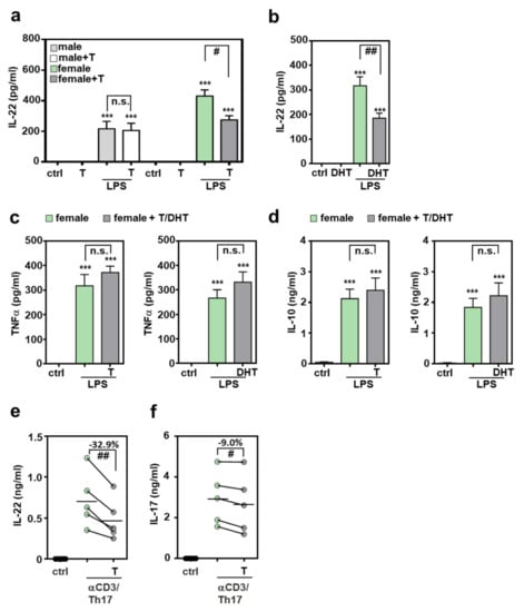 Inhibition of IL-22 production by androgens: (a–d) freshly isolated male or female murine splenocytes of C57BL/6J mice were kept as unstimulated ctrl or stimulated for 48 h with LPS (1 µg/mL) in presence or absence of testosterone or DHT (both at 1 µM). (e,f) Splenocytes of female C57BL/6J mice were kept as unstimulated control or cultivated under Th17-differentiation conditions with or without testosterone (1 µM) for 4 days. All cultures were adjusted to a final concentration of 0.0014% (vehicle for testosterone; a,c-left,d-left,e,f) or 0.029% (vehicle for DHT (b,c-right,d-right)) methanol. Release of indicated cytokines was determined by ELISA: IL-22 (a,b,e), TNFα (c), IL-10 (d) and IL-17 (f) (a,c-left,d-left): n = 8; (b,c-right,d-right): n = 7; (e,f): n = 5; *** p < 0.001 versus ctrl of respected sex, # p < 0.05, ## p < 0.01). Statistical analysis: (a–d) raw data were analyzed by one-way ANOVA with post hoc Bonferroni correction; data are shown as means ± SEM; (e,f) raw data were analyzed by paired t-test and displayed as linked dot-plot of individual mice; crossbars mark the mean value of the data points. T, testosterone; DHT, 5α-dihydrotestosterone; n.s., not statistically significant.