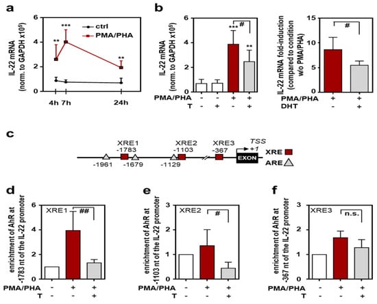 Ahr is regarded to be of pivotal importance for efficient IL-22 production by diverse cell types, most important Th17, γδT cells, and type 3 innate lymphoid cells [,]. The murine il22 promoter actually displays three distinct Ahr-binding xenobiotic responsive elements (XRE1-3) within 2 kB upstream of the putative il22 transcriptional start site. Interestingly, two of these sites (XRE1 and XRE2) are located in the vicinity of androgen responsive elements (ARE) (Figure 4c). In a consecutive next step, chromatin immunoprecipitation (ChIP) analysis was performed to evaluate physical binding of Ahr to the il22 promoter under control conditions or the influence of testosterone. Binding of Ahr to XRE1 (Figure 4d) and XRE2 (Figure 4e) elements, but not to the XRE3 element (Figure 4f), was significantly reduced after testosterone conditioning of EL-4 cells.