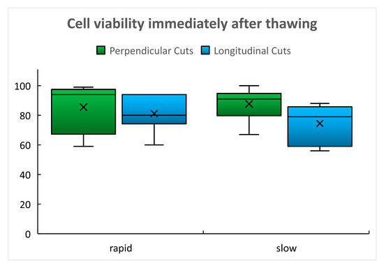 The basic descriptive statistics data are summarized in Table 1. High viability values, mean and median above 70%, were found in using both thawing protocols and both types of cuts.