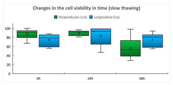 In the group of slowly thawed grafts, the mean cell viability assessed after 24 h of culture (Table 2, Figure 2) was practically identical as immediately after thawing. Decline in the cell viability in slices obtained by PC occurred after 48 h of culture (Table 2 and Figure 2, green box-plots). This difference was statistically significant after G–G correction performed because of the inequality of variances (48 h vs. 0 h, p = 0.014; 48 h vs. 24 h, p = 009). The mean cell viability in slices obtained by LC (Table 2, Figure 2, blue box plots) remained practically unchanged and globally statistically insignificant (p 0.4222) during the whole culture period.