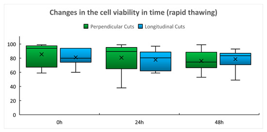 Changes in the post-thaw cell viability in time—rapid thawing (%).