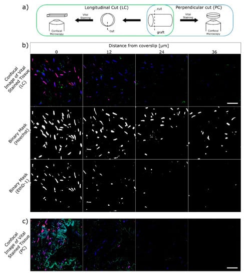 In situ staining of the thawed vascular graft sample with fluorescence vital dyes. (a) Scheme of the longitudinal (LC) and perpendicular (PC) cuts preparation. (b) Confocal images in four Z-planes for LC and subsequent binary masks used for automatic evaluation of viability. (Top) All cells in blue (Hoechst), dead cells in red (EthD-1), and enzymatic activity in green (calcein). (Middle and bottom) Comparison of dead cell count (EthD-1 mask) and total cell count (Hoechst mask). Scale bar 50 μm. (c) Confocal images in color for PC. Note the internal cavity of the graft and majority of the cells on the “cut” side stained red. Scale bar 50 μm.