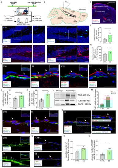 2.1. EE Exposure Induces Meningeal Niche Remodeling