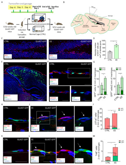 To identify the lineage of the immature neurons, which increased in the meninges after the exposure to EE, we took advantage of an inducible transgenic mouse model for the radial glial cells. The GLAST-CreERT2 mice [32], intercrossed with the CAG-CAT-EGFP reporter line [33] (GLAST-GFP), allowed all the GLAST+ cells and their progeny to be labeled by GFP following tamoxifen administration. After 3 days of tamoxifen induction via oral gavage, we subjected the mice to 15 days of the EE, and then we analyzed the brain and the retrosplenial meninges of the control and treated mice (Figure 2A,B) [32].