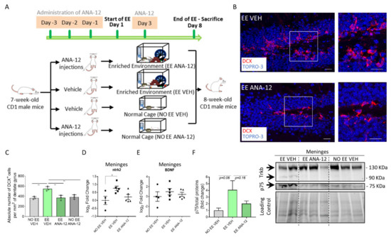 We found that TrkB was expressed in the meninges, and following EE exposure, it increased in association with the β3-Tubulin meningeal progenitors (Figure 1M–O). TrkB receptor activation is suppressed by ANA-12 [37], a non-competitive inhibitor. In order to provide evidence that the meningeal response was directly regulated by the activation of the neurotrophic receptor TrkB, we administrated ANA-12 to CD1 mice 3 days before and at the third day of EE exposure (Figure 3A) [38]. In order to compare the effect of EE exposure and EE exposure plus the ANA-12 inhibitor, we set up the following experimental groups: EE ANA-12 (animals exposed to EE and injected with the inhibitor), EE VEH (animals exposed to EE and injected with the vehicle), NO EE VEH (single-housed animals receiving just vehicle injections) and NO EE ANA-12 (single-housed animals receiving the inhibitor) (Figure 3A).