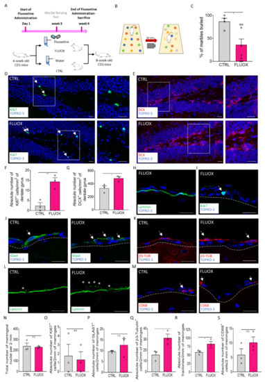 The meningeal niche responds to fluoxetine treatment. (A) Schematic representation of the experimental design used for fluoxetine administration. (B) Schematic representation of behavioral testing for OCD-like behavior via the marble burying test (MBT). (C) Graph showing the percentage of marbles buried by treated (FLUOX) and non-treated (CTRL) animals. (D,E) Sagittal brain sections of the CD1 mice, showing the presence of Ki67+ cells (green) and DCX+ cells (red) in the hippocampal dentate gyri (DGs) in the CTRL and FLUOX animals. A white box highlights a DG zone reported as a magnification on the right panel. (F) Graph showing the number of Ki67+ cells per mm2 of DG in the CTRL and FLUOX animals. (G) Graph showing the number of DCX+ cells per mm2 of DG in the CTRL and FLUOX animals. (H) Sagittal brain section of the CD1 mice, showing the brain meningeal nuclei and meningeal basal laminin (green) in a FLUOX animal. (I) Sagittal brain section of CD1 mice, showing a brain meningeal Ki67+ (green) cell in a FLUOX animal. The meninges are delineated via white dashes. (J) Sagittal brain sections of CD1 mice, showing brain meningeal GLAST+ cells in the CTRL and FLUOX mice. The meninges are delineated via white dashes. (K) Sagittal brain sections of CD1 mice, showing brain meningeal β3-Tubulin+ (red) cells in the CTRL and FLUOX mice. The meninges are delineated via white dashes. (L) Sagittal brain sections of CD1 mice, showing fractones (*) identified via laminin (green) staining in the brain meninges of the CTRL and FLUOX mice. (M) Sagittal brain sections of CD1 mice, showing brain meningeal CD68+ (red) cells in the CTRL and FLUOX mice. The meninges are delineated via white dashes. (N–S) Graphs showing the number of (N) nuclei, (O) Ki67+ cells, (P) GLAST+ cells, (Q) β3-Tubulin+ cells, (R) fractones and (S) CD68+ cells in 2 mm of the retrosplenial brain meninges of the CTRL and FLUOX animals. Data are presented as the mean ± SEM, and n.s. = not statistically significant. * p value ≤ 0.05. ** p value ≤ 0.01. In (D,E,H–K,M), the nuclei are in blue (TOPRO-3 nuclear staining). (H–M) are single-plane confocal images. (D,E) are maximum-intensity projections of z-stack confocal images. The scale bars represent 20 µm. White arrows indicate positive cells, while asterisks indicate fractones.