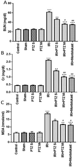 Effect of various treatments on serum levels of BUN (A), Scr (B), and MDA (C). Bars represent mean ± SEM. Significant difference between groups is analyzed by Student’s t-test after one-way ANOVA test (n = 8), where: ^^^^: p < 0.0001, compared to normal control group. *: p < 0.05, **: p < 0.01, ***: p < 0.001, and ****: p < 0.0001, compared to IRI group. #: p < 0.05, ##: p < 0.01, compared to (IRI + PTZ S) group.