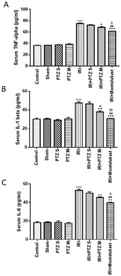 Effect on levels of inflammatory cytokines. Serum levels of (A) TNF-α, (B) IL-1β, and (C) IL-6 (pg/mL) for the different groups. Bars represent mean ± SEM. Significant difference between groups is analyzed by Student’s t-test after one-way ANOVA test (n = 8), where ^^^^: p < 0.0001, compared to normal control group. *: p < 0.05, **: p < 0.01, ***: p < 0.001, compared to IRI group. #: p < 0.05, ##: p < 0.01, compared to (IRI + PTZ S) group. $: p < 0.05, $$: p < 0.01, compared to (IRI + PTZ M) group.