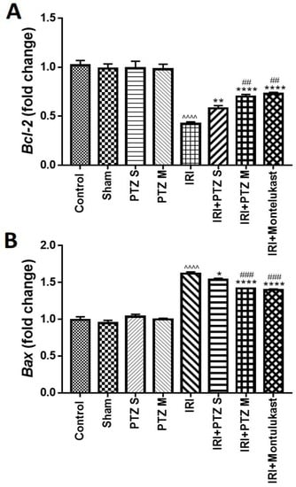 In addition, Figure 3B shows that IRI significantly (p < 0.0001) increased the renal mRNA levels of Bax, which is a pro-apoptotic gene, relative to rats of the normal control group. Furthermore, treating IRI rats with PTZ S and PTZ M showed a significant (p < 0.05 and p < 0.0001, respectively) decrease in renal mRNA levels of Bax when compared to IRI rats. Interestingly, treating IRI rats with PTZ M showed a significant (p < 0.001) reduction in renal mRNA levels of Bax when compared to IRI rats treated with PTZ S.