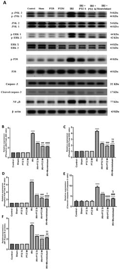 Western blotting was performed to check the influence of pantoprazole on various proteins’ expression in treated rats to explain the abovementioned obtained effects, using montelukast as a control treatment. Western blotting showed a significant (p < 0.0001) renal up-regulation of phosphor-JNK1/2/total JNK1/2, phosphor-ERK1/2/total ERK1/2, phosphor-P38/total P38, cleaved caspase-3/caspase-3, and total NF-κB proteins in injured rats compared to normal rats after normalizing the intensities of bands to β-actin. Interestingly, treating IRI rats with PTZ resulted in significant (p < 0.0001) down-regulation of all proteins compared to IRI rats. Furthermore, the expression level of all proteins in the (IRI + PTZ M) group was significantly lower than that in (IRI + PTZ S) group, as shown in (Figure 4).