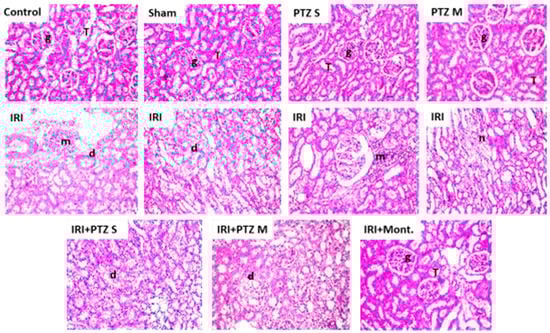 Histopathological examination of the renal tissues of different groups. Hematoxylin–eosin-stained sections of kidneys of the control-group rats (Control), sham-group rats (Sham), PTZ S-group rats (PTZ S), PTZ M-group rats (PTZ M), IRI-group rats (IRI), IRI + PTZ S-group rats (IRI + PTZ S), IRI + PTZ M-group rats (IRI + PTZ M), and IRI + montelukast-group rats (IRI + Mont). Where (g): the cortex glomeruli, (T): tubules, (m): periglomerular focal inflammatory cells aggregation, (d): degenerated tubules, and (n): focal coagulative necrosis. Magnification: ×40.