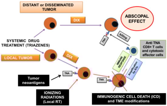 Experiments by us and others revealed that (a) certain anticancer drugs, particularly triazenes, induce the appearance of TNA (i.e., DIX); (b) other chemical agents and certain cytokines amplify the expression of TAA and TNA; (c) ionizing radiation provokes the “abscopal effect” if delivered under particular conditions, generating a sort of “in situ vaccine” [,]; and (d) ionizing radiation and cancer chemotherapy can afford ICD, which contributes efficiently to the host immune response against malignant cells (see Figure 5). The described features are anticipated to substantially improve the antitumor immune response elicited through ICI.