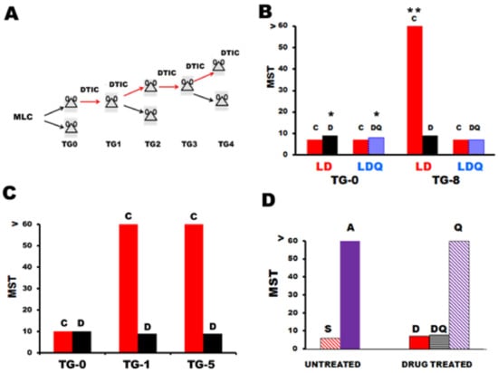 DTIC-induced xenogenization. Quinacrine interferes with DTIC-induced xenogenization, but not with the antitumor or immunosuppressive activity of this drug, or with the onset of resistance to the triazene compound. (A) Graphic protocol showing the treatment scheme utilized to expose in vivo mouse leukemia cells (MLC) to DTIC (100 mg/Kg ip, day 1–5, []) in the course of sequential transplant generations (TGs). At each TG recipient mice were left untreated or treated with DTIC for the subsequent TG. (B) Co-administration of DTIC + quinacrine abrogates the DIX effect afforded by DTIC alone []. LD line, L5178Y leukemia of DBA/2 origin, passaged (106 cells ip) in CD2F1 mice treated with DTIC alone (D, black columns); LDQ line, same line passaged in mice treated with DTIC + quinacrine (Q, 20 mg/Kg ip, day 1–5 after challenge, blue letting columns). Red columns indicate survival times of untreated controls of LD or LDQ lines. Moreover, Q treatment alone was entirely inactive (data not shown). At TG8, the DIX effect was not detectable in the LDQ line but only in the LD line, which became strongly immunogenic (i.e., all 8 untreated controls lived more than 60 days, whereas the DTIC-treated mice died as a result of DTIC-induced immunosuppression []). Moreover, after several TGs, LDQ became entirely resistant to the antitumor effect of DTIC, thus confirming that Q did not prevent chemo-resistance to DTIC (data not shown). (C) Early DIX detectable in the LDQ line. CD2F1 mice were challenged with 106 cells ip of the non-immunogenic LDQ line (collected from leukemic donors at TG9). Thereafter, the mice were treated with DTIC alone, and at the following TG1 the majority of untreated controls survived beyond the 60-day observation period. (D) Quinacrine does not prevent the immunosuppressive effects of DTIC. A total of 106 cells of L5MF-22 lymphoma of B10.129(5M) (H-2b) origin were inoculated intravenously into untreated syngeneic recipients (S) or into H-2-incompatible allogeneic (A) CD2F1 (H-2d/H-2d) mice. All CD2F1 mice (blue column) rejected the tumor whereas all syngeneic recipients (red dashed column) died within 6–7 days. Allogeneic CD2F1 hosts treated with DTIC (50 mg/kg ip, daily, day 1 through 5 after tumor challenge) alone (D, red column), or associated with quinacrine (20 mg/Kg, day 1-5) DQ (grey columns), died of generalized lymphoma within 6–8 days after challenge, without any significant difference between the two groups. All allogeneic mice treated with quinacrine alone (Q, violet dash column) rejected L5MF-22 cells. MST, median survival times. Panel B: * p < 0.05 (Mann–Whitney “U” test) respective to untreated controls at TG 0. At TG8, ** p< 0.01. In all other panels the reported differences are highly significant (p < 0.01).