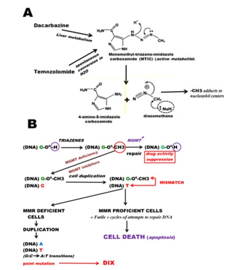 Triazene derivatives (e.g., DTIC and TMZ) and hydrazine derivates (e.g., procarbazine) are highly mutagenic compounds. Different from DTIC and procarbazine, TMZ does not need metabolic activation. The main biochemical mechanisms underlying the mutagenic activity of triazenes [] leading to DIX is illustrated in Figure 3. Upon metabolic activation of dacarbazine, which occurs predominantly in the liver, the reactive metabolite MTIC is formed, which is released into the blood stream and enters tumor cells by diffusion. In the cell, the metabolite decays spontaneously, yielding carbenium ions that methylate the tumor DNA at different sites of the purine and pyrimidine bases. One of the DNA methylation products is O6-methylguanine (O6MeG). Although formed in minor amounts (maximally 8% of total alkylations), it is responsible for most of the point mutations induced by these agents, since O6MeG has highly mispairing properties, pairing with thymine during replication []. This is followed by GC-to-AT transition mutations. For this process, replication is required, which implicates that proliferating tumor cells exhibit a high mutation rate. There is another important condition that is required for successful mutagenicity (Figure 3B), namely, the absence or strongly reduced activity of the DNA repair protein O6-methylguanine-DNA methyltransferase (MGMT). This protein removes the methyl group from the O6-position of guanine through transfer to an internal cysteine and thus restores guanine in the DNA. Therefore, it prevents point mutations induced by DNA-methylating drugs. It is interesting that MGMT is highly regulated and silenced in many tumors [,]. Thus, in malignant glioma (grades III and IV), MGMT is completely lacking in about 20% of the tumors and epigenetically downregulated in about 40% of neoplasias, resulting in a significant decrease in MGMT repair activity [,,]. A process that counteracts mutagenicity through O6MeG is mismatch repair (MMR), as O6MeG:T mismatches are recognized by MMR proteins (MSH2/MSH6) [] and erroneously processed in a futile repair cycle, yielding DNA double-strand breaks that trigger cell death [] and senescence []. Through this process, cells harboring premutagenic changes can be eliminated. However, all experimental systems in which mutations through O6MeG were measured showed that MMR does not eliminate all premutagenized cells, and mutations increase linearly with dose and O6MeG level []. It is also conceivable that in cancer cells apoptotic processes are blocked or defective, e.g., through upregulation of antiapoptotic factors such as survivin, BCL-2, or lack of caspases [,]. In this case, mutated cells will survive and propagate, and finally express mutated proteins followed by TNA presentation.